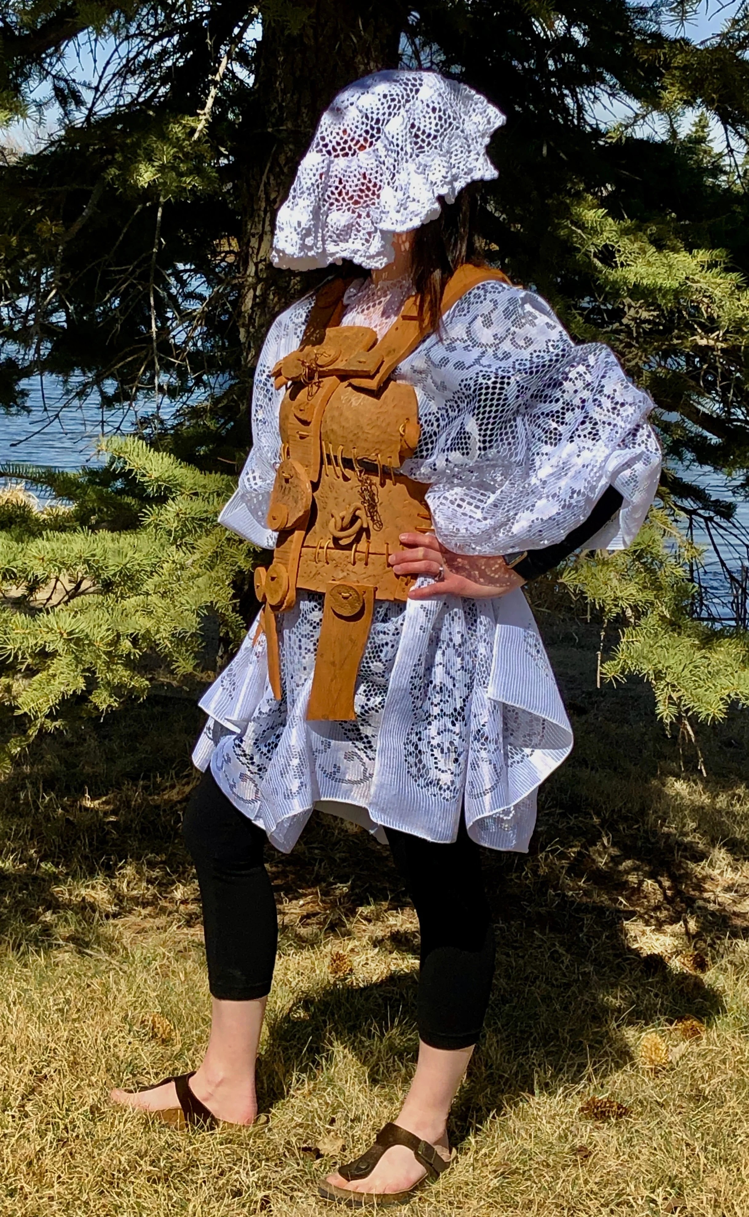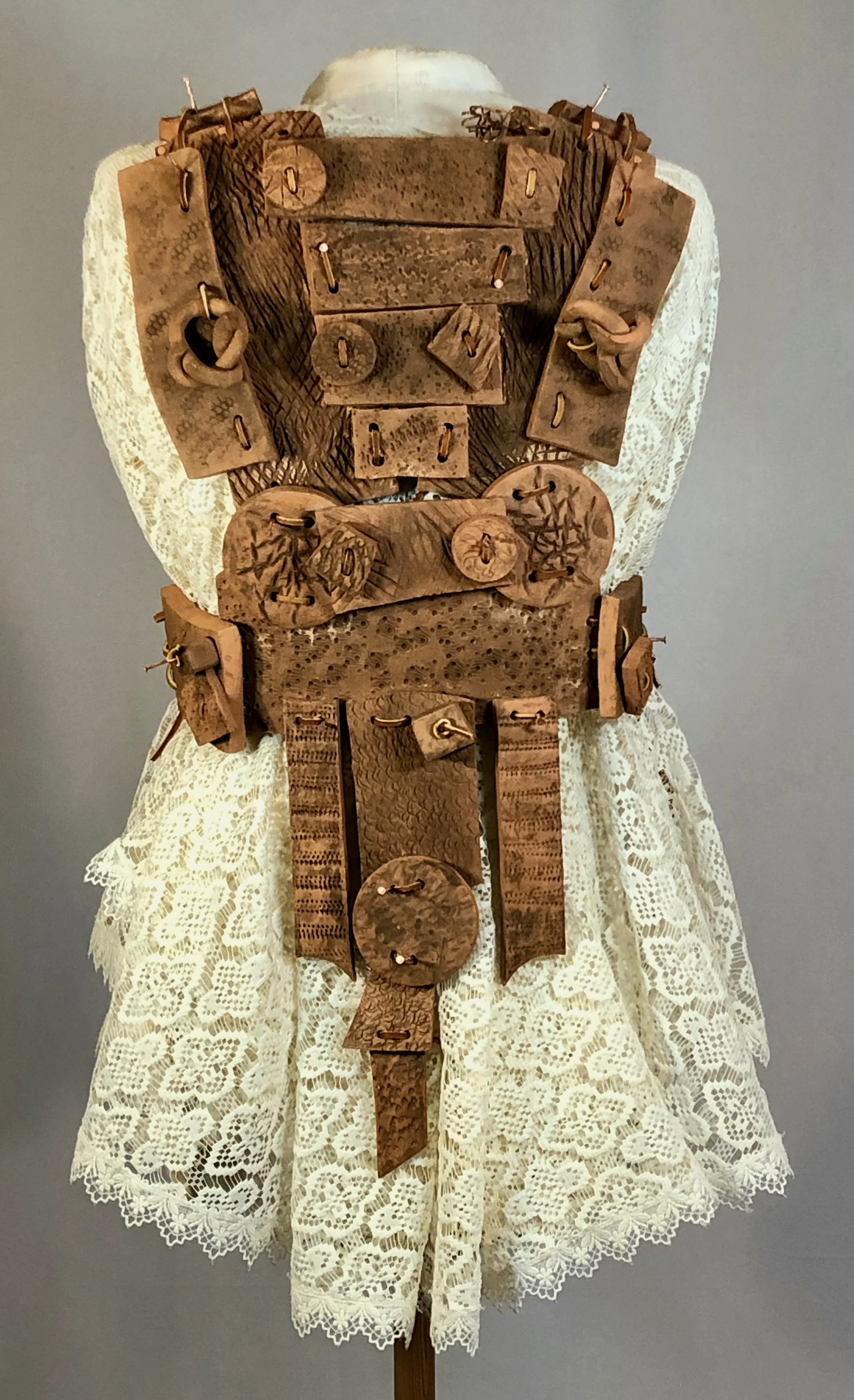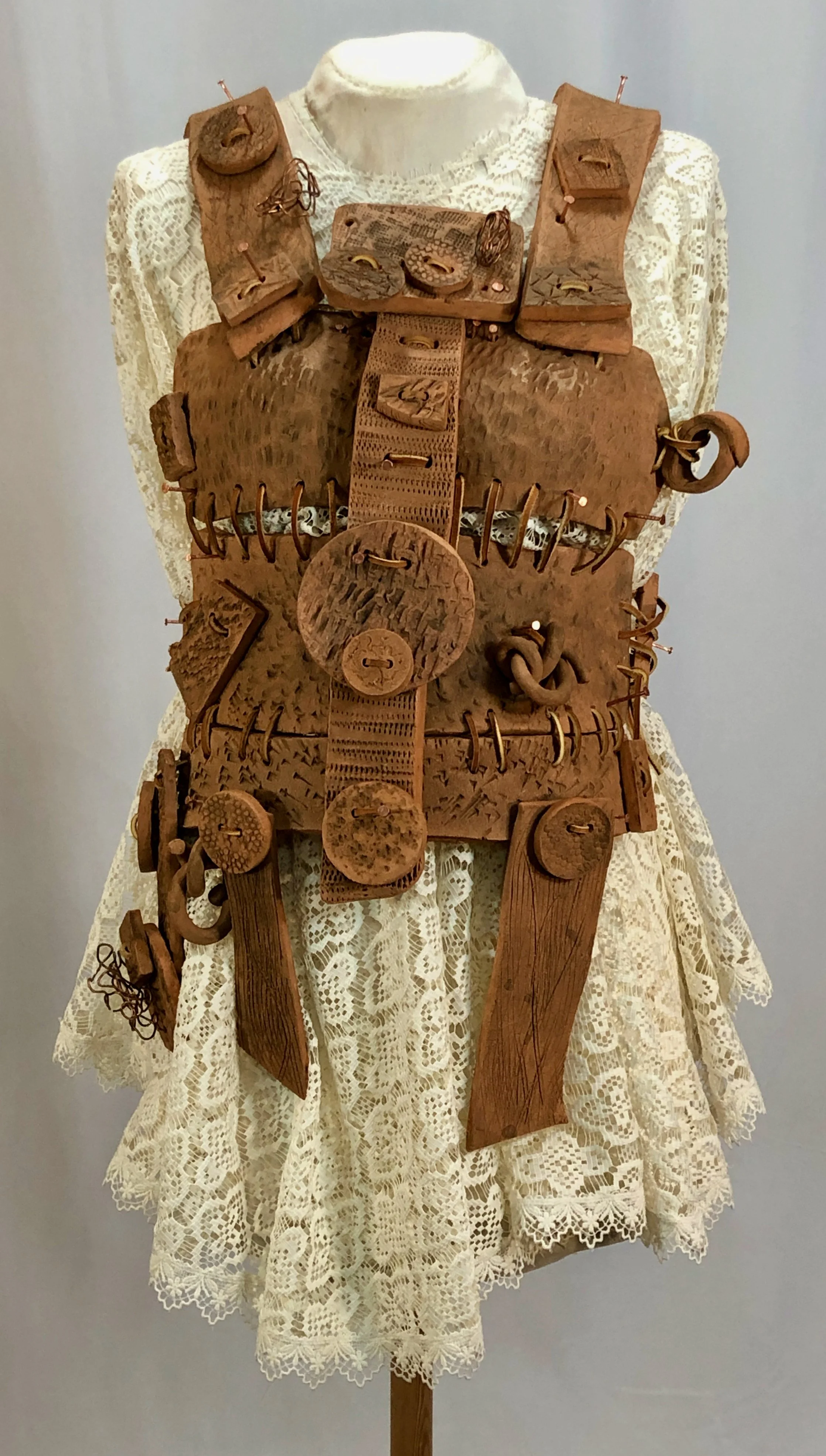 Materials: clay, acrylic paint, copper wire, copper nails, lace fabric